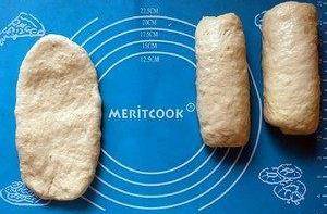 取出松弛好的一個面團,光滑那一面朝下,搟成牛舌型,再卷起成圓筒。
