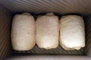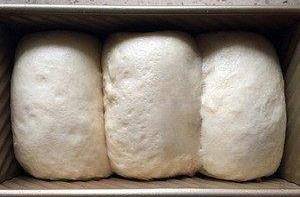 35~37度環境中蓋上保鮮膜發酵,山形吐司就發到8分滿,方形吐司就發到9分。我一般都會在烤箱中放置一盤溫水提高濕度(夏天千萬不要放開水!要不溫度濕度會過高!)