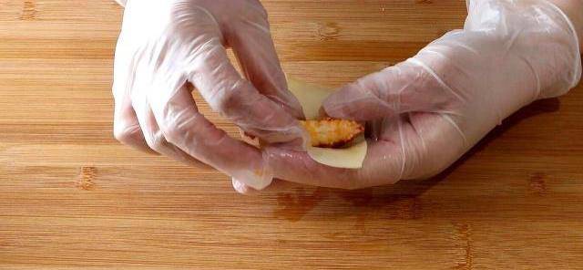 取一片芝士片,包裹住2顆龍蝦肉,備用。