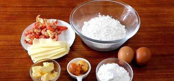 小龍蝦肉,芝士片,咸蛋黃2個,低筋面粉150g,玉米淀粉30g,黃油40g,鹽2g,雞蛋2個。