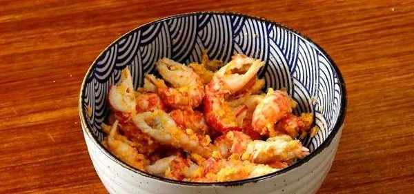 用勺子將咸蛋黃碾碎,放入剝好的龍蝦肉,拌勻,使得蝦肉表面均勻地粘上一層咸蛋黃。