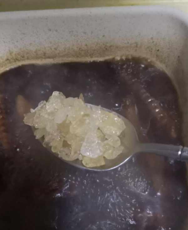 7.等到湯汁被收的還剩一半的時候就把冰糖給放進去。