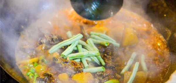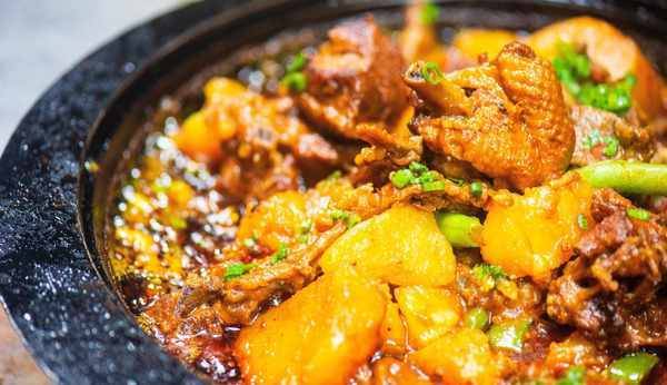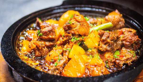 這時炒鍋中的湯沸騰瞭,我們就可以關火直接端著炒鍋,把裡面的鴨肉和土豆倒入石鍋上。由於此時的石鍋已經加熱過,所以倒入的鴨湯又被重新加熱沸騰瞭看起來非常神奇。此時和朋友圍在一起吃著這沸騰的美味,出一身熱汗別提多舒服瞭。