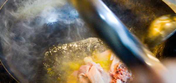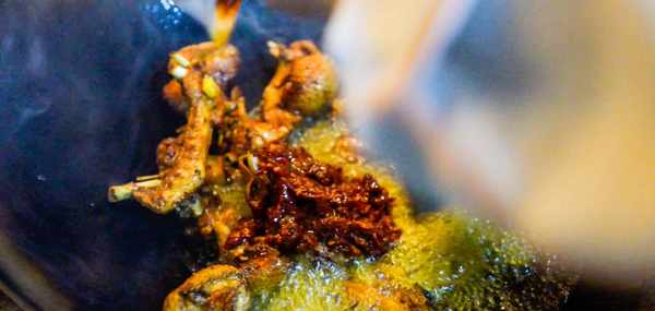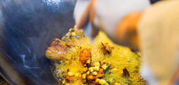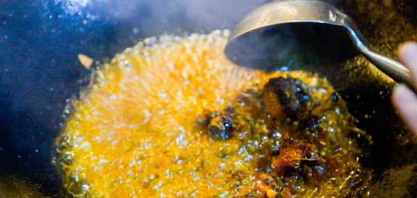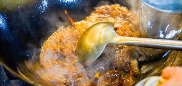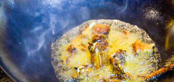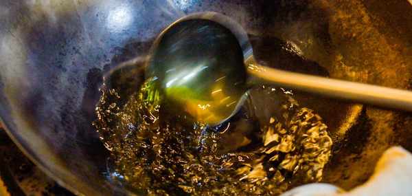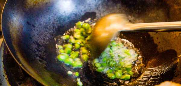 炒鍋中多倒入一些菜籽油,開大火把油燒熱。下入竹筷子觀察氣泡,當氣泡冒出速度稍微快一些油溫約為6成熱。
