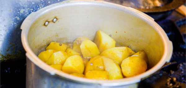 土豆去皮切成小塊,用漏盆沖洗掉外部的淀粉也順便下入鍋中。這時我們在高壓鍋中加入八角、草果、和冰糖蓋好蓋子開火燒。當高壓鍋冒氣時開始計時,大約過上7分鐘鍋裡的鴨肉和土豆就煮熟瞭。