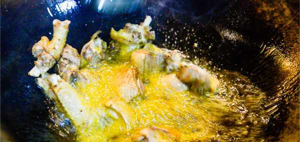此時就可以把洗過之後的鴨塊下入鍋中慢炸,下鍋之前小心不要被濺出的熱油燙傷。炸的過程當中為防止糊鍋底,一邊炸一邊用漏勺推。