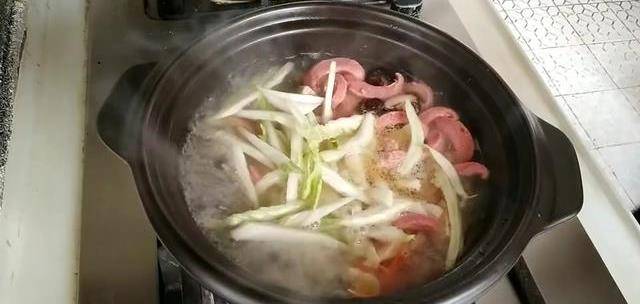 然後再加入凍豆腐和香腸,煮兩分鐘以後再加入粉絲、胡蘿卜絲,還有白菜,然後加點鹽和胡椒粉調味,接下來加生抽、麻油,最後加入白菜葉煮熟,出鍋之前上一點香油,砂鍋菜就做好瞭。