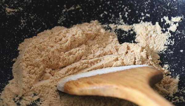 自制幹吃湯圓時可以搭配黃豆粉和椰蓉等食材,黃豆粉要提前炒熟。幹凈無油的炒鍋中倒入生黃豆粉,中小火不停地翻炒。火力不要太大,否則容易炒糊。當黃豆粉的顏色變深,有濃鬱的豆香味散發出來時關火盛出,冷卻備用。