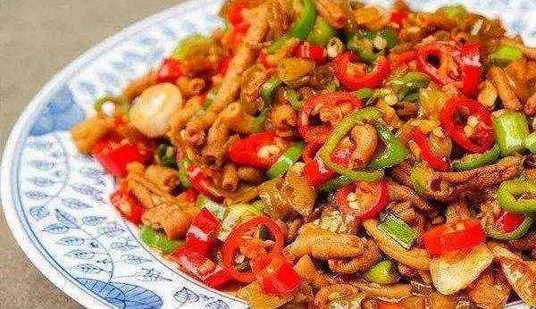 做法二、將雞胗焯水變色後撈出起鍋熱油,下入雞臉煸炒。油溫盡量高一些,不可以炒的時間太久。