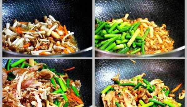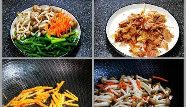 【詳細做法】:1、準備食材,蘑菇去根洗凈備用;蒜苔洗凈去兩端,切成小段,胡蘿卜去皮切絲備用;