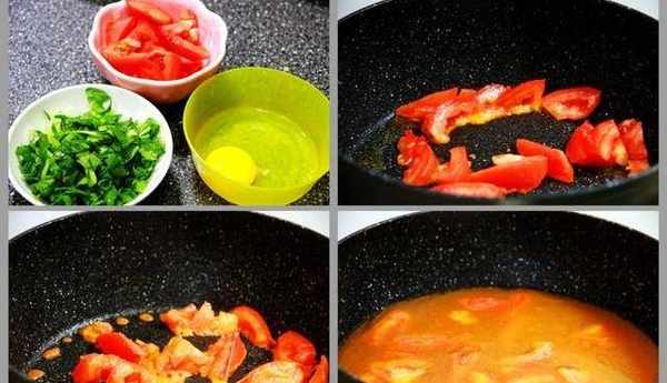 【詳細做法】:1、準備好所需要的原料,番茄切成小塊,青菜切碎,雞蛋打到碗裡;