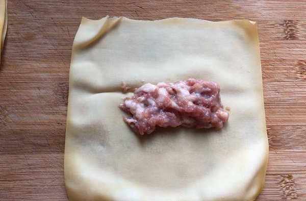 4、百葉切成大小合適的形狀,然後加入攪拌好的肉餡,加入到中間,加入肉餡的多少,根據自己的喜好和熟練程度決定,隻要百葉能均勻的包裹上就可以瞭。