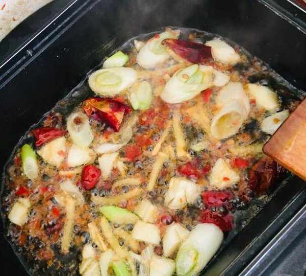 第3步、小涮鍋上火加入底油燒熱,放花椒炸香,放蔥薑蒜幹辣椒、剁辣椒爆出香味。