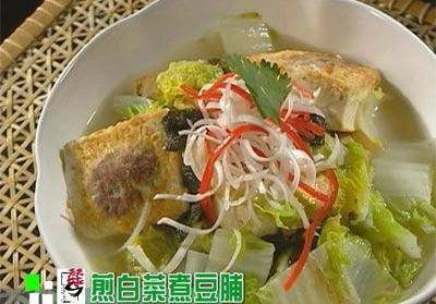 2、平鍋中加入油,將豆腐分別沾勻蛋液放入鍋中煎至兩面金黃,加入白菜,沖適量清水加蓋燜煮3分鐘,開蓋後放入紫菜,加味精、鹽、胡椒粉調味即可。