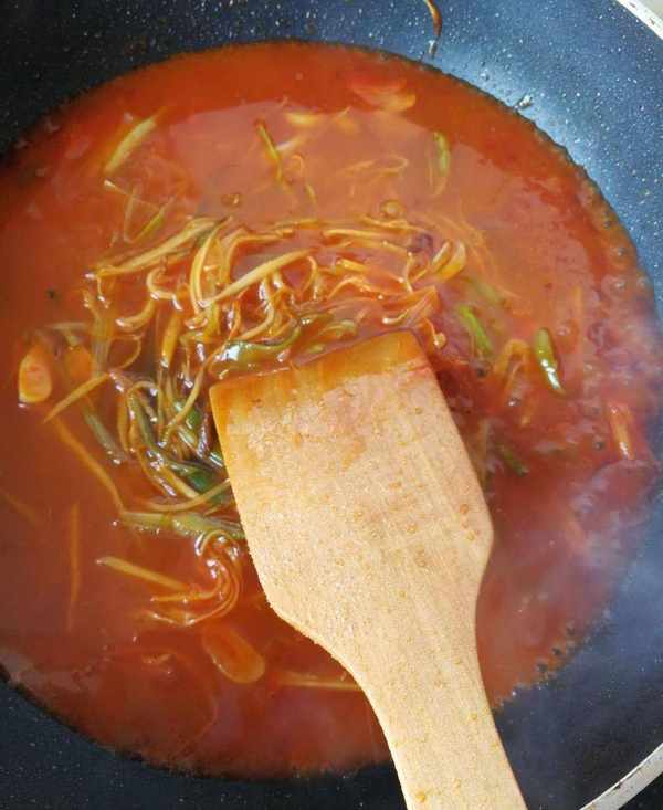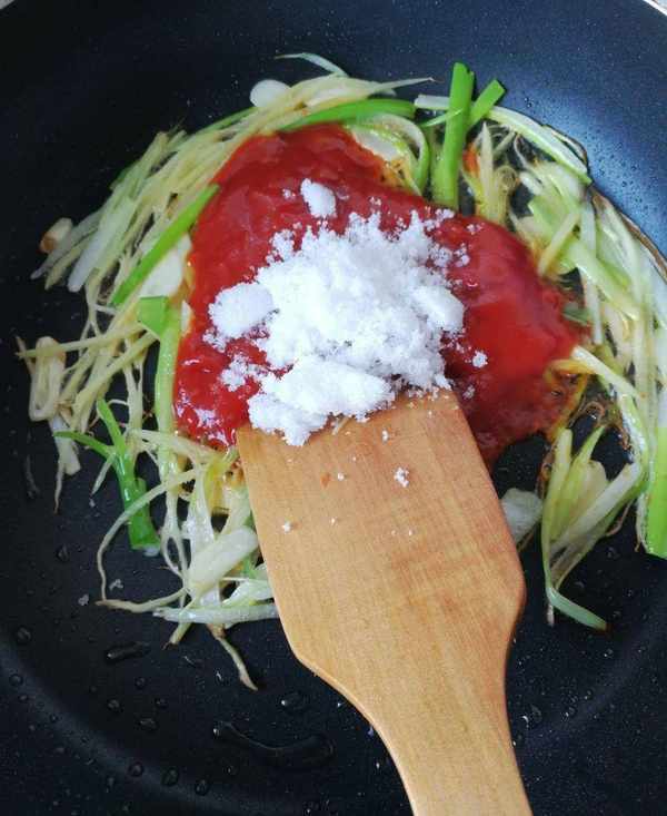加入番茄醬、白糖、少許蘋果醋、鹽,加少許清水炒香、炒亮…