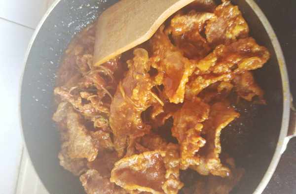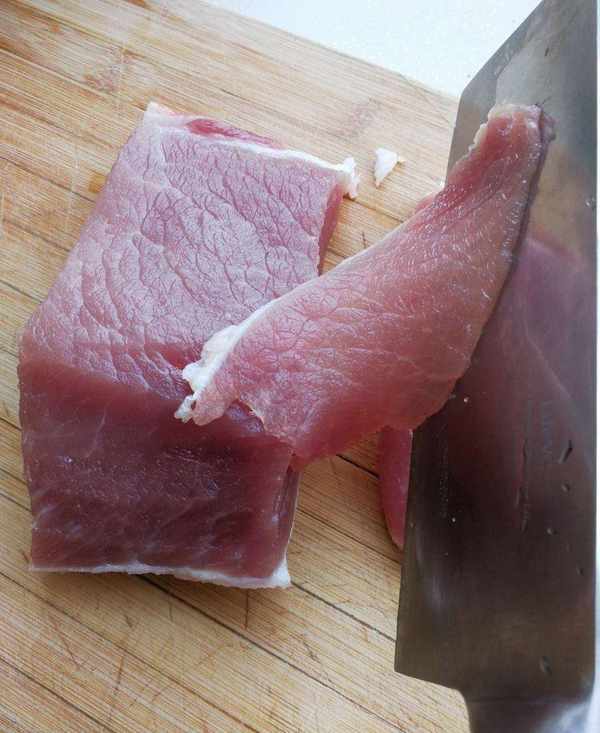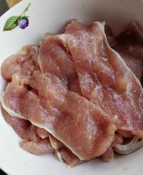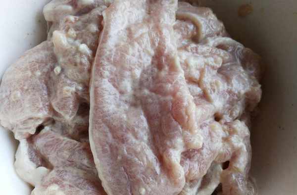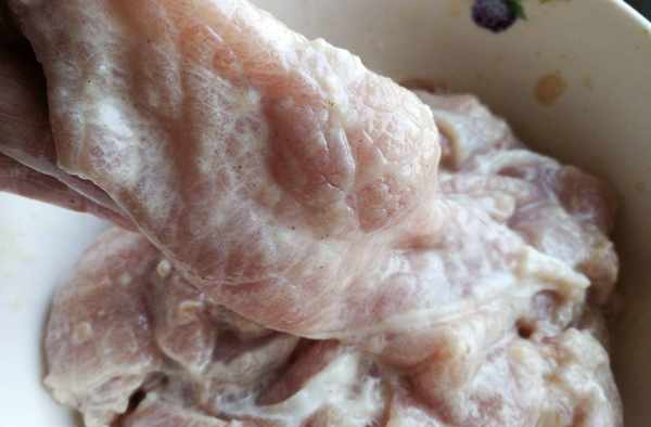 入味兒的肉片掛上水淀粉(濃芡)抓勻。