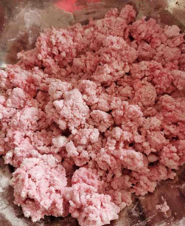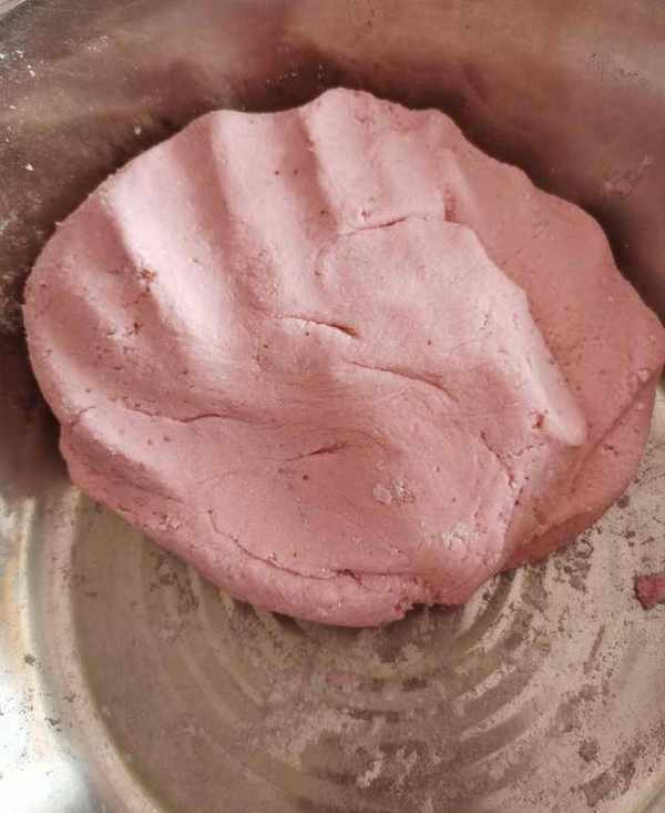 準備糯米粉加入草莓汁,用筷子攪拌至沒有幹面粉,用手將面粉揉成光滑面團。
