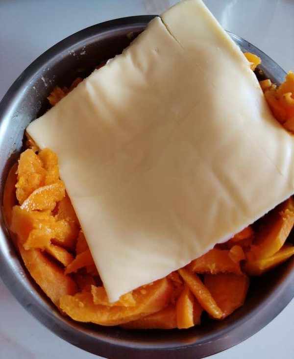 將小香薯洗凈去皮,切片,放入鍋中蒸熟,加入一片芝士用勺子搗爛即可。