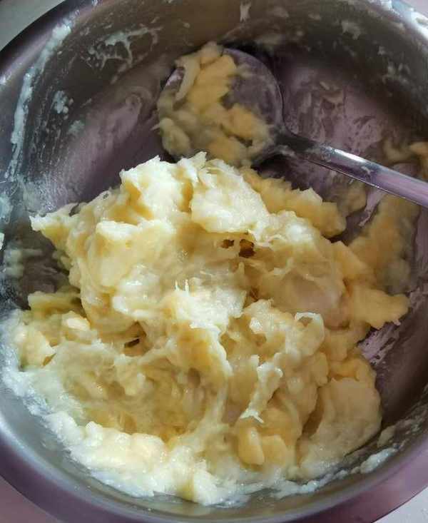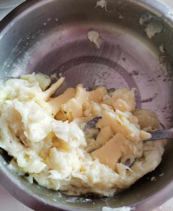 將榴蓮核去掉,果肉加半片芝士用勺子搗爛,攪拌均勻。