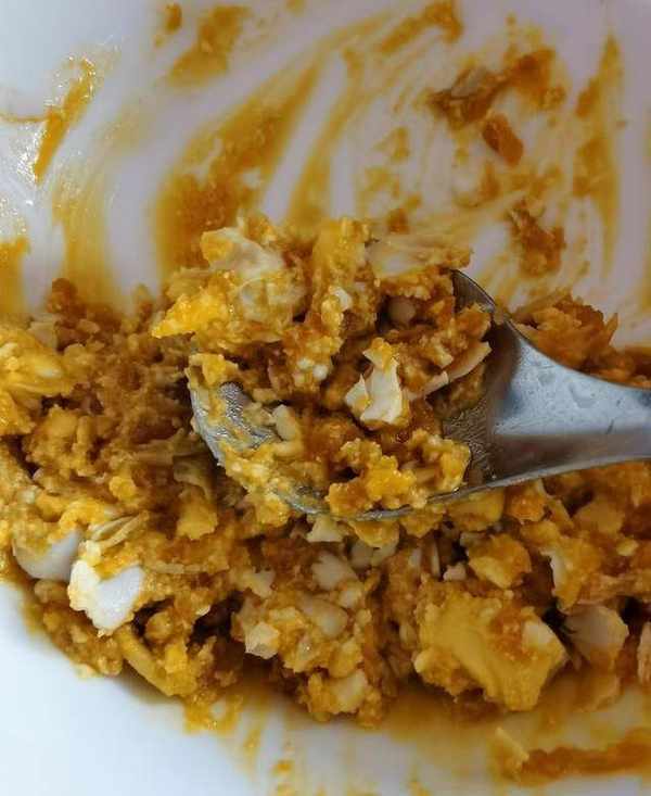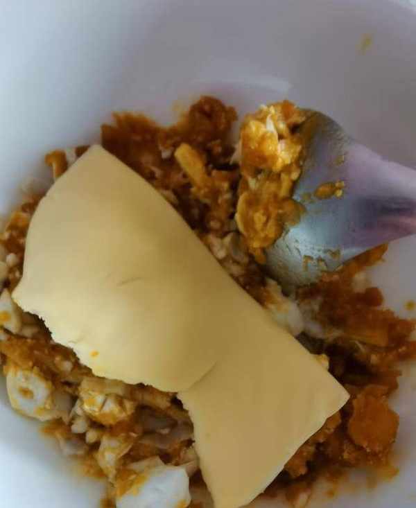 將咸蛋黃用勺子搗爛加入半片芝士拌勻。