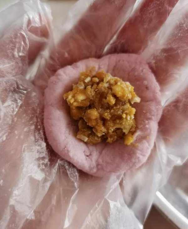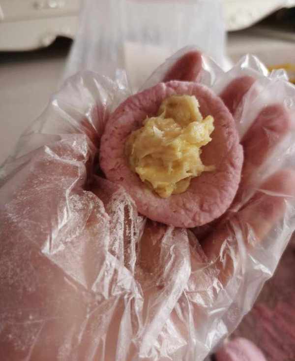 取一小塊面團,揉成圓形,按扁,包入餡料,揉成圓形面團。