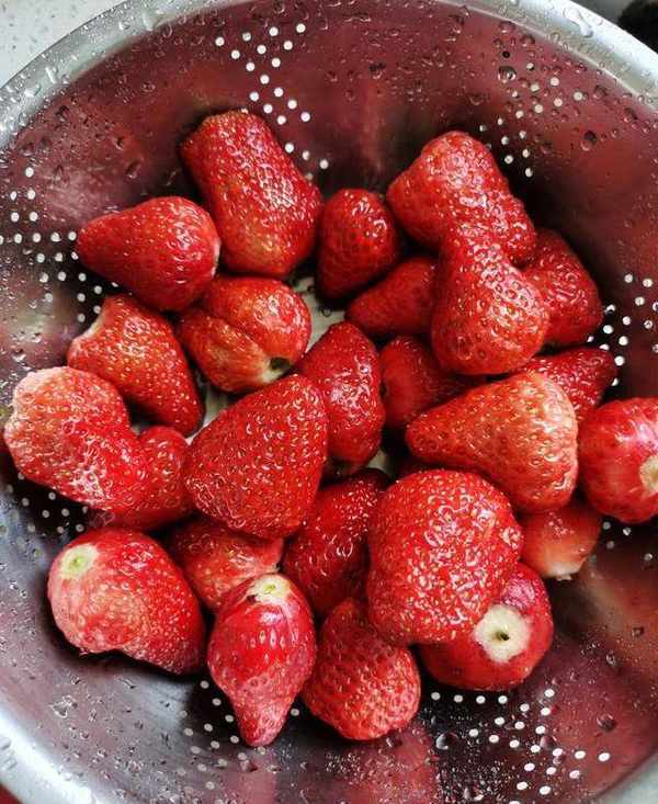 將草莓洗凈,切塊。放入榨汁機加入清水榨汁。