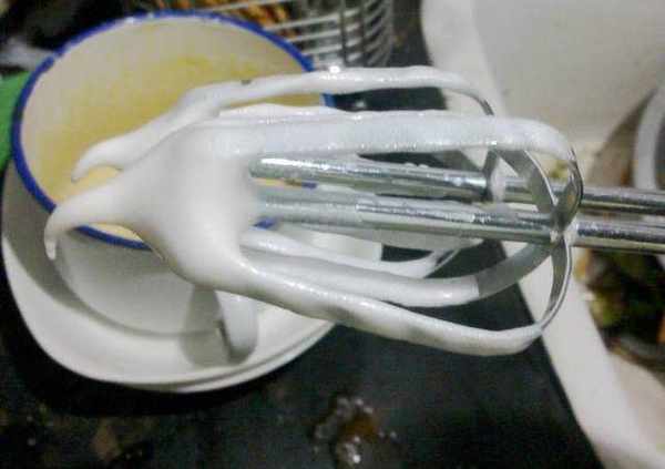 用打蛋器再打5分鐘,蛋清的泡沫豐富而細膩時,把剩餘的白糖全部加入。用打蛋器再打3分鐘,蛋清打至濕性發泡時,露出小彎鉤時即可。