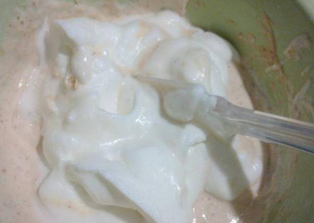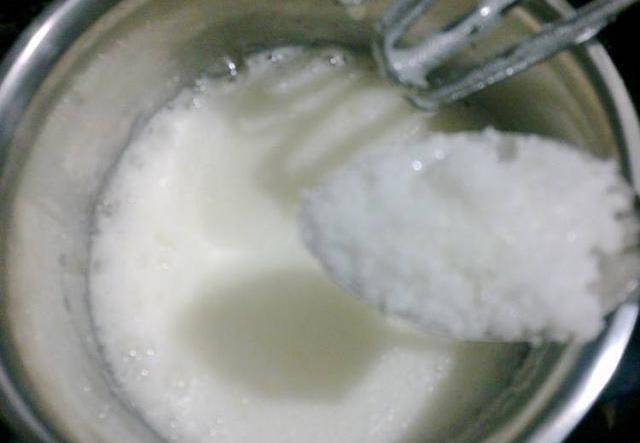 把蛋清打起粗泡時放入幾滴白醋。打至泡沫略豐富時加入一勺白糖。用打蛋器再打3分鐘,蛋清打至泡沫非常豐富,再加一勺白糖。