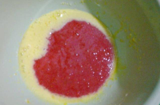 蛋黃加色拉油用打蛋器攪打均勻,看不到油花。加入100g草莓泥拌勻。