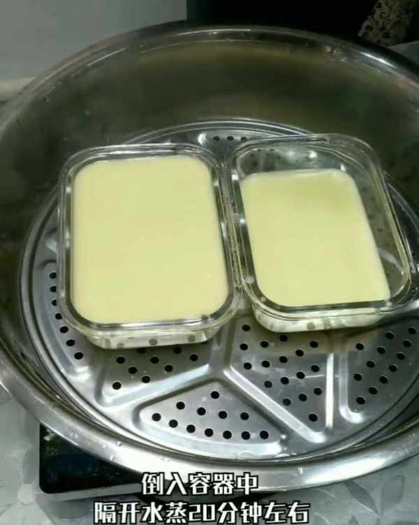 5、步驟4的生熟漿倒入容器,水開後下鍋蒸20分鐘;馬蹄糕蒸多久要看量,如果量多,時間要久一點;