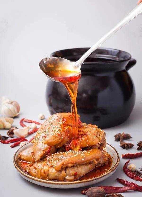 2.不銹鋼桶內放入自制的香辣鹵水,大火燒開後放入豬手,小火鹵制70分鐘,關火繼續浸泡30分鐘,撈出。客人點菜時,取豬手一片(1人份)放在容器內,淋入香辣鹵水50克,澆上小料即可。