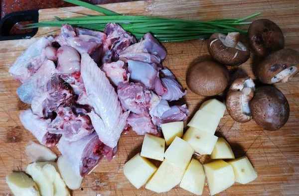 1、根據自己的準備好適量的食材,土豆用清水沖洗幹凈之後,削去土豆皮然後用刀切成適量大小。香菇切去底部蒂不要,用清水沖洗幹凈即可。雞肉同樣用清水沖幹凈,隨後用刀切成自己需要的大小。韭菜洗凈後切成小段。生薑洗凈切片。