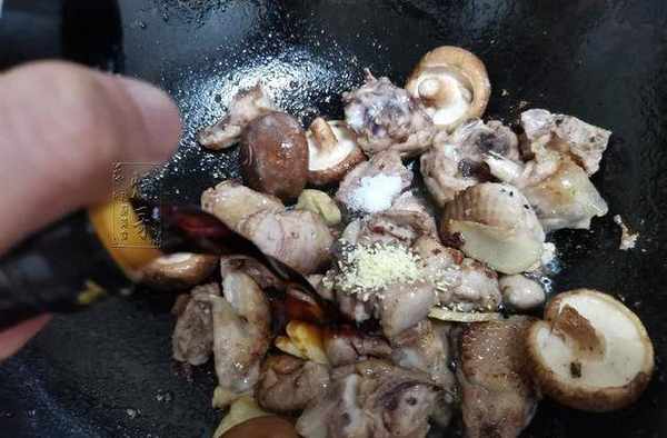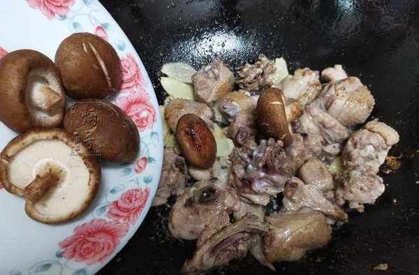 4、直至把鍋裡的生薑和雞肉一塊翻炒均勻,炒出香味之後。香菇也就可以下鍋瞭。