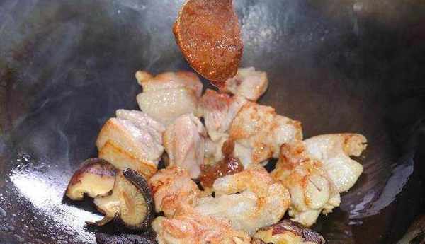 Step1:將香菇對半切好備用、冬粉泡水半小時後瀝幹備用,去骨雞腿肉切成小塊,開中火熱油鍋後放入雞腿肉。