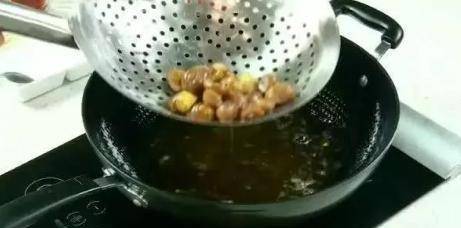 熱鍋燒油,油熱後倒入板栗,稍微炸一下後撈出備用。