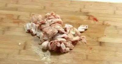 然後,將雞肉洗凈切成塊,蔥切成段,薑切成片,蒜苗剝皮洗凈後切成段,備用。