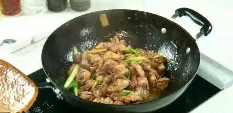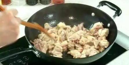 接著,倒入雞肉煸炒,炒至雞肉表面微黃後撈出。