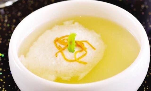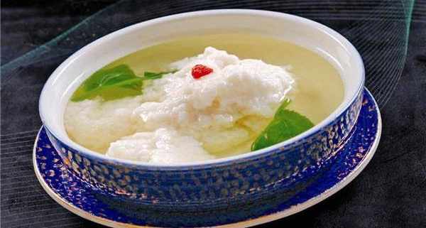1、成菜形似豆花、質地滑嫩、湯清肉白、鮮美異常。是川中清淡醇厚的代表菜之一。