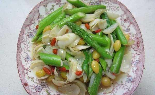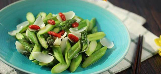2、然後熱鍋放油將焯好的蘆筍和百合放進去進行翻炒,再加入少許食用鹽進行調味,最後在加上一點水淀粉勾芡即可出鍋,裝完盤的時候在上面加提前泡好的枸杞。