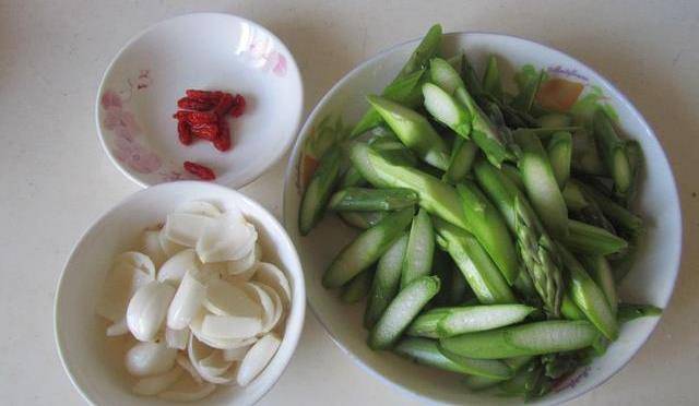 準備材料:蘆筍(1小把)、鮮百合(2個)、枸杞(3~5顆)、淀粉(一小勺)、油鹽(適量)。