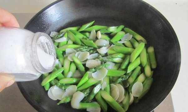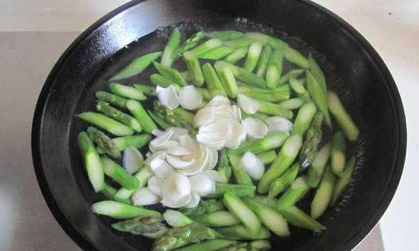 1、首先我們把買回來的蘆筍將粗糙的部分去除外皮,隻需要留下細嫩的部分。然後起鍋燒開水放入適量的鹽和幾滴油,然後將洗幹凈的蘆筍和百合放入鍋中焯水,等待蘆筍變色即可撈出過一遍涼水。