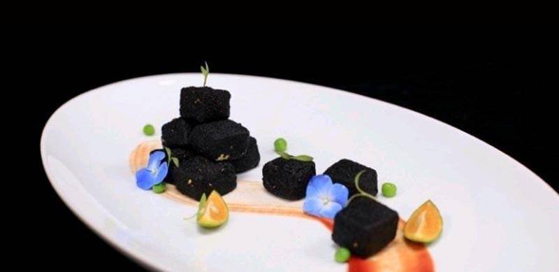黑豆腐改刀切成小方塊,裹上竹炭粉炸粉