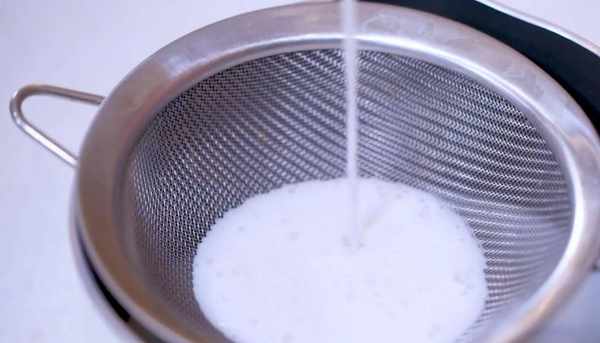 【步驟二】將熬到軟爛的豬皮放入料理機中打碎,然後再把打好的豬皮漿放入漏勺中過濾一下。將過濾出來的漿汁回鍋煮開,然後再等它煮至一分鐘就可以關火。再把它倒出來,放涼後放到冰箱裡面等它凝固成形。