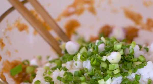 【步驟四】接著來調制豬肉餡,半斤的五花肉餡裡面淋入一點點的麻油,再加入3克的老抽,和10克的蠔油,3克的白砂糖,2克的鹽,60克的蔥薑水倒進去,往裡面撒一點胡椒粉再次攪拌均勻,味道就非常充足瞭。攪勻之後要順一個方向快速攪拌讓它起勁,這樣吃起來口感更加加班的差不多後,把切好的蔥白切碎放進鍋中。