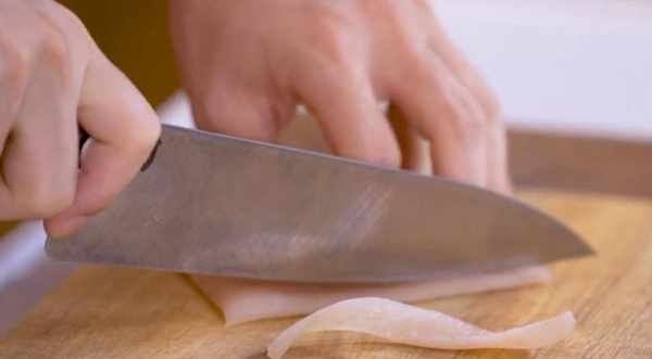 【步驟一】首先我們來制作餡料。去過油脂的豬皮一塊,將它改刀切成長條狀,再改刀將它切短一點。鍋中倒入冷水,冷水中放入幾片薑片,然後把豬皮倒進去。水開後,開中小火熬制一個小時。時間差不多瞭,就關火把薑片給夾出來扔掉不要。