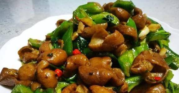 最後,把青椒全部放入鍋內,用大腸炒一下。然後加入兩勺鹽和適量的老抽,老抽上色後,鍋裡的配料會看起來更好。另外,由於啤酒在煎炸過程中中加,最終炸出的大腸不僅沒有異味,而且更加美味。