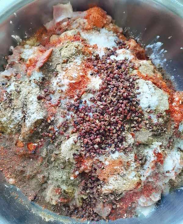 豬前腿肉:10斤 辣椒面:130g 食鹽:140g
