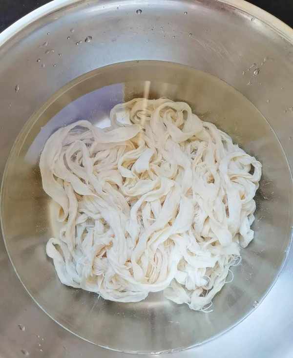 3.鹽漬豬腸衣,洗去鹽漬,放水裡加白酒泡半個小時,然後套在水龍頭上沖洗幾遍。