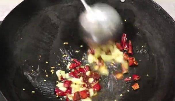 把鍋燒熱加入油。薑蒜片、幹辣椒。再來勺豆瓣醬。一起翻炒一下。炒出紅油,倒入青紅椒。然後我們開大火一起翻炒一下,料酒去腥。少來一點點清水,稍微一點點鹽,再來一點雞精,白糖提鮮,生抽醬油一點點,少許的胡椒粉,開大火翻炒一下。