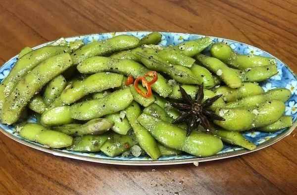 食材:毛豆適量、蒜末適量、八角數個、花椒少許、辣椒少許、黑胡椒適量、鹽巴適量、香油少許